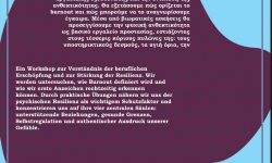 📅 Δευτέρα 15 Δεκεμβρίου 🕕 18:00 📍 Mittelstraße 33, 12167 Berlin Το εργαστήριο αυτό στοχεύει στην κατανόηση της εργασιακής εξουθένωσης και την ενίσχυση της ψυχικής ανθεκτικότητας. Θα εξετάσουμε πώς ορίζεται το burnout και πώς μπορούμε να το ναγνωρίσουμε έγκαιρα.Μέσα από βιωματικές ασκήσεις θα προσεγγίσουμε την ψυχική ανθεκτικότητα ως βασικό εργαλείο… …