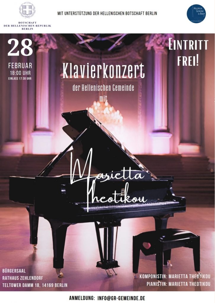 Ενα μουσικό ταξίδι με πιάνο που θα σας συγκινήσει! 🎹 Η Ελληνική Κοινότητα Βερολίνου έχει τη χαρά να σας προσκαλέσει σε ένα μοναδικό κονσέρτο πιάνου, την Τετάρτη, 28 Φεβρουαρίου.