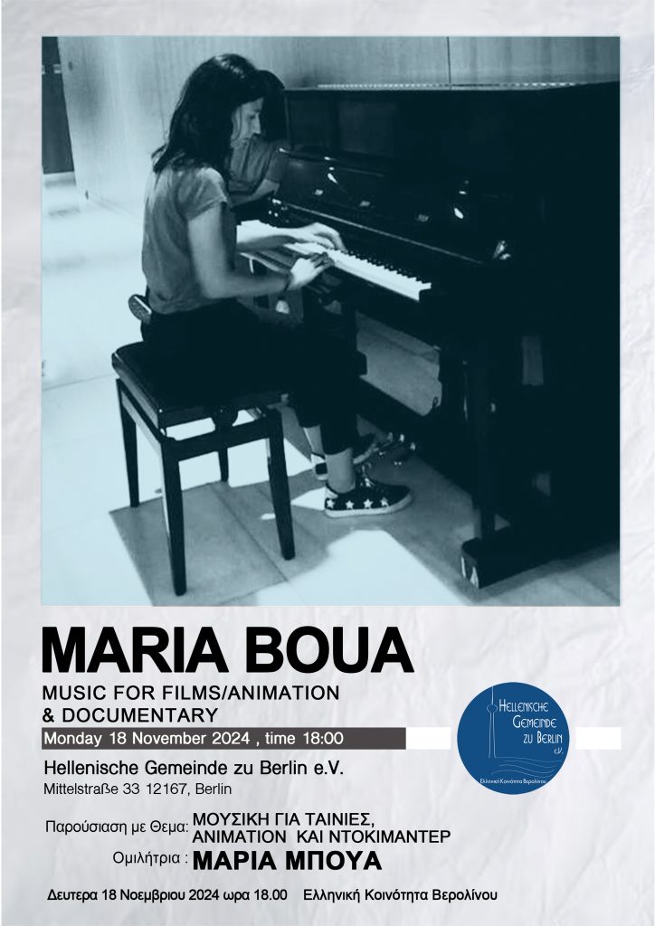 Maria Boua wurde in Korfu geboren. Sie studierte an der Fakultät für Musikwissenschaften der Ionischen Universität und spezialisierte sich auf Komposition für darstellende Künste, Jazz, klassische Musik und elektroakustische Komposition. Sie schloss ihr Studium in klassischem Klavier und Theorie am Konservatorium von Korfu mit Auszeichnung ab. Sie schloss ihren Master in Kunst und Tontechnik an der Abteilung für Musikstudien der Ionischen Universität ab. Sie unterrichtet Musik (Klavier, Theorie usw.) und komponiert Musik für Kino- und Kurzfilme, Dokumentarfilme, Animationsfilme, Theater, zeitgenössisches Tanztheater, Werbefilme und Videospiele. Darüber hinaus komponiert er Musik für Filme und führt bei Dokumentarfilmen Regie und produziert sie.