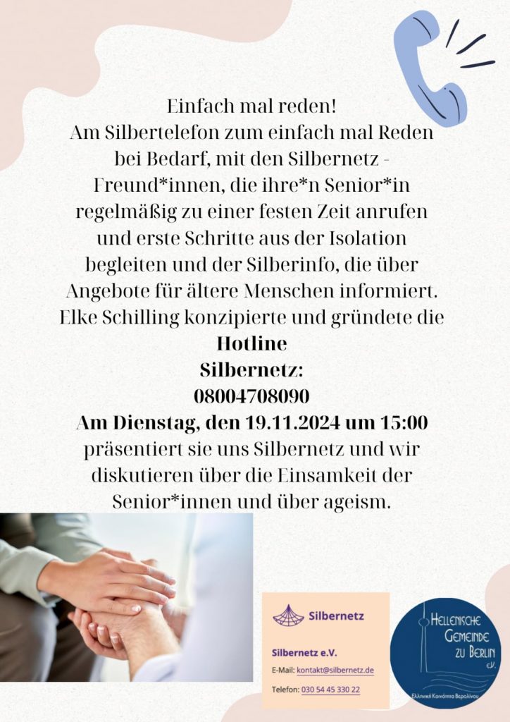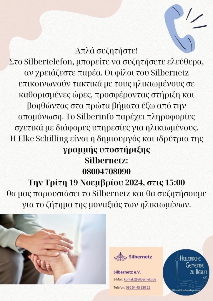 Την Τρίτη 19 Νοεμβρίου 2024, στις 15:00 θα μας παρουσιάσει το Silbernetz και θα συζητήσουμε για το ζήτημα της μοναξιάς των ηλικιωμένων.
