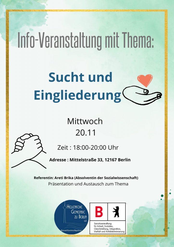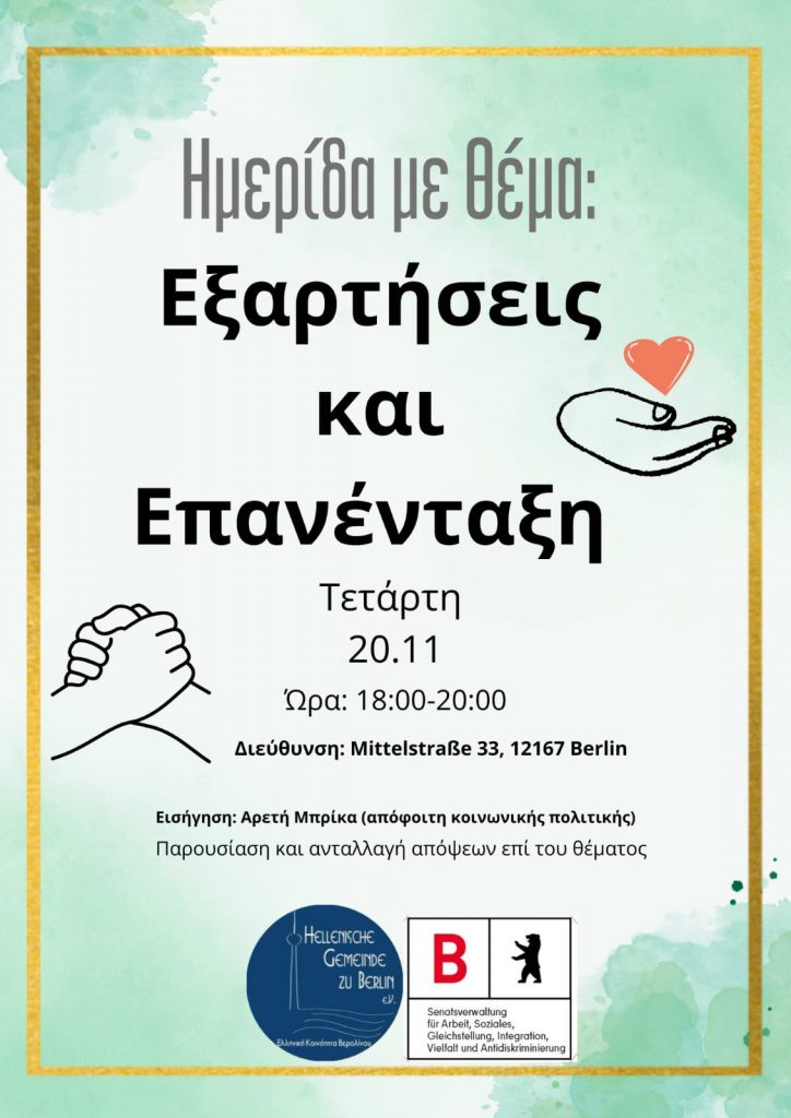 Η Ελληνική κοινότητα Βερολίνου σας προσκαλεί σε Ημερίδα με θέμα τις Εξαρτήσεις και την κοινωνική Επανένταξη όπου θα γίνει παρουσίαση από την απόφοιτη του Δημοκρίτειου Πανεπιστημίου Θράκης Μπρίκα Αρετή. Στην συνέχεια θα διεξαχθεί συζήτηση επί του θέματος με ανταλλαγή απόψεων. Η Ημερίδα θα πραγματοποιηθεί την Τετάρτη στις 20.11.24 στις 18:00-20:00.