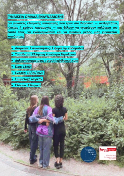 Γυναικεία Ομάδα Ενδυνάμωσης Απευθύνεται σε γυναίκες ελληνικής καταγωγής που ζουν στο Βερολίνο, ανεξαρτήτως ηλικίας και χρόνου παραμονής.