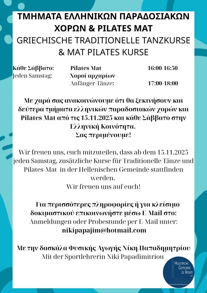 Με χαρά σας ανακοινώνουμε ότι θα ξεκινήσουν και δεύτερα τμήματα ελληνικών παραδοσιακών χορών και Pilates Mat από τις 15.11.2025 και κάθε Σάββατο στην Ελληνική Κοινότητα, Mittelstr. 33 12167.