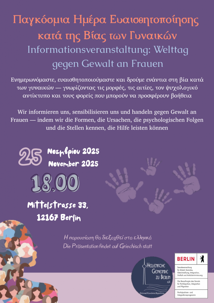 Die Präsentation wird von Sofia Marmarotouri, Psychologieabsolventin der Panteion Universität Athen, geleitet. Die Diskussion wird sich auf die psychologischen Dimensionen geschlechtsspezifischer Gewalt, deren Folgen für die Betroffenen sowie auf Wege der Unterstützung und Stärkung von Frauen fokussieren.