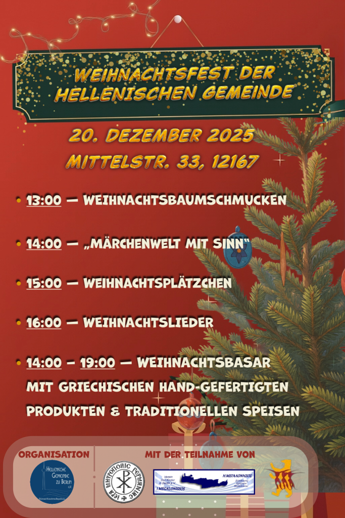 Wir freuen uns darauf, euch alle zur Weihnachtsfest der Hellenischen Gemeinde willkommen zu heißen, um gemeinsam mit Freude und guter Stimmung zu feiern!