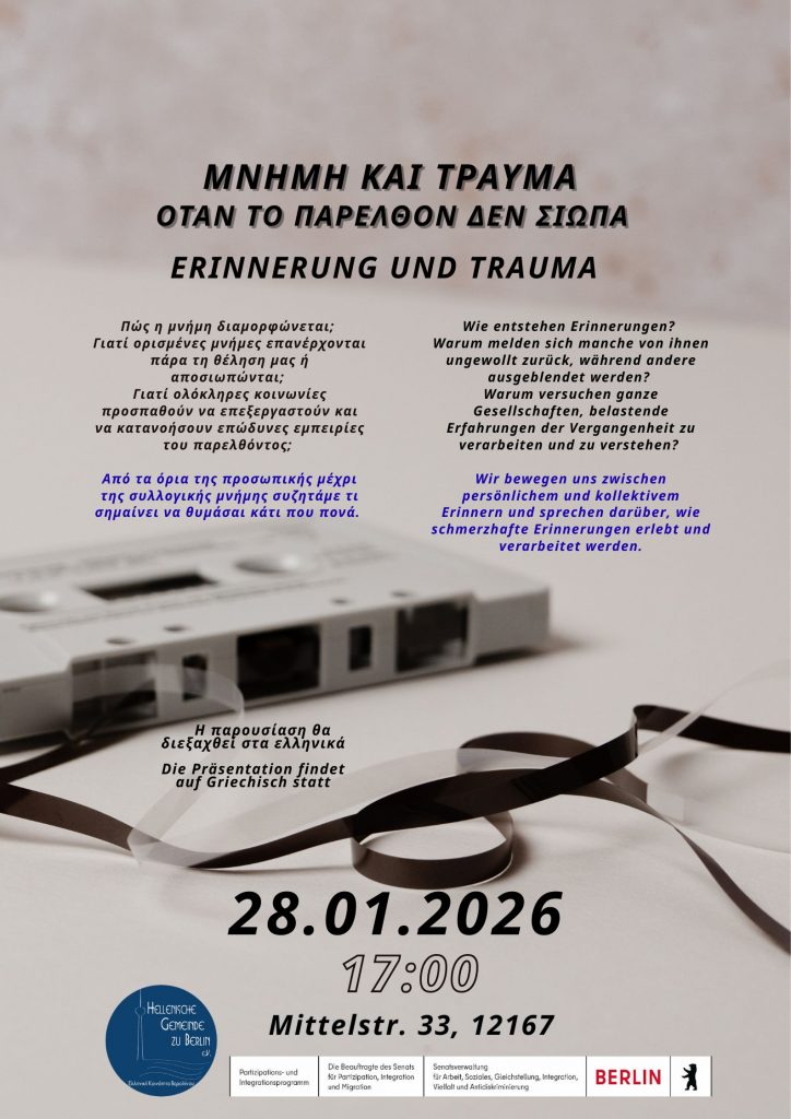 Die Veranstaltung wird von Maria Koutsogianni, Absolventin der Psychologie an der Panteion-Universität Athen, moderiert. Aus psychologischer Perspektive beleuchtet sie die Dimensionen von Erinnerung und Trauma.