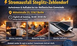 Die Hellenische Gemeinde zu Berlin e. V. öffnet ihre Räume zum Aufwärmen & Aufladen von mobilen Geräten.