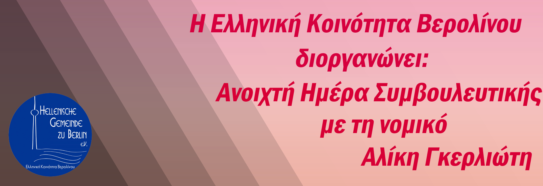 Η Ελληνική Κοινότητα Βερολίνου σε συνεργασία με τη νομικό Αλίκη Γκερλιώτη οργανώνουν μια μέρα ανοιχτής συμβουλευτικής στο Ελληνικό Πολιτιστικό Κέντρο του Βερολίνου, Mittelstr. 33, 12167.