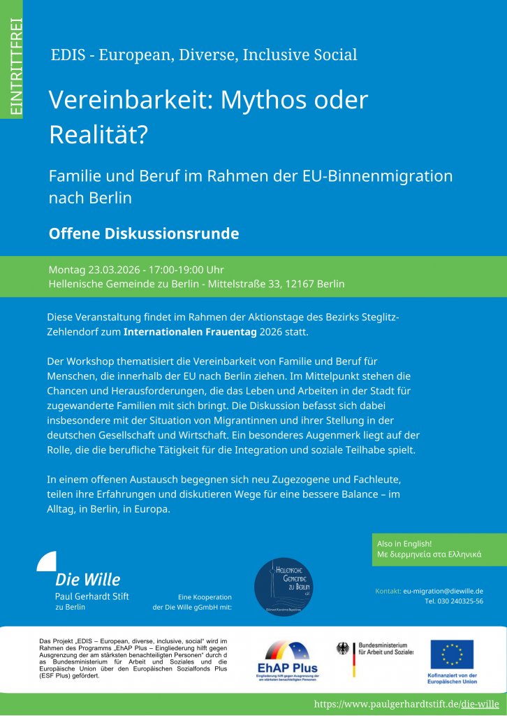 Informationsveranstaltung des Beratungsprogramms EDIS in Zusammenarbeit mit der Hellenischen Gemeinde zu Berlin im Rahmen der Aktionstage des Bezirks Steglitz-Zehlendorf zum Internationalen Frauentag 2026: