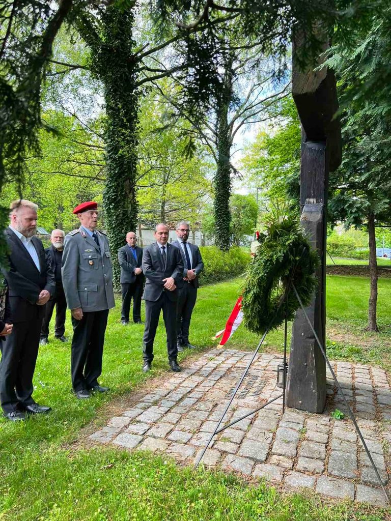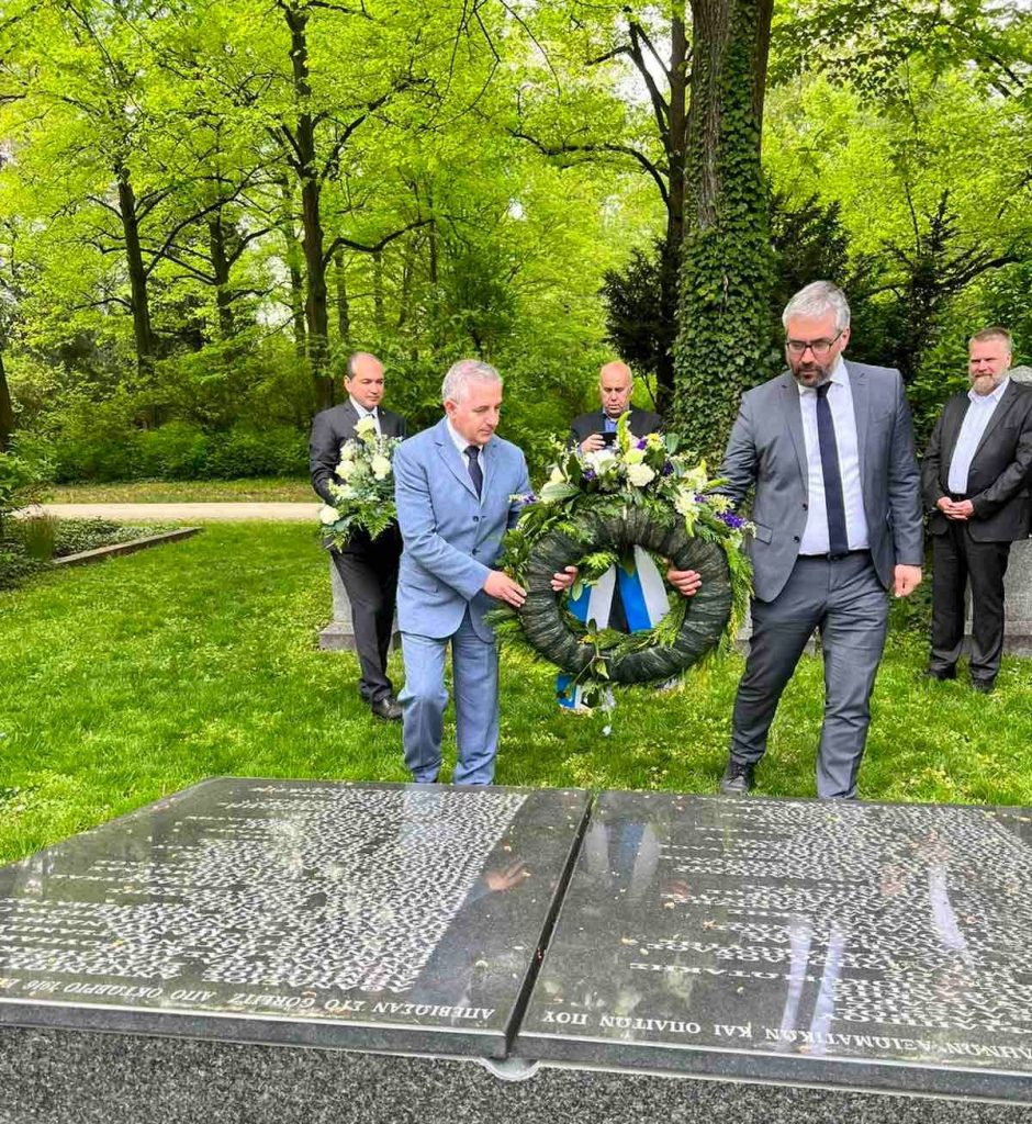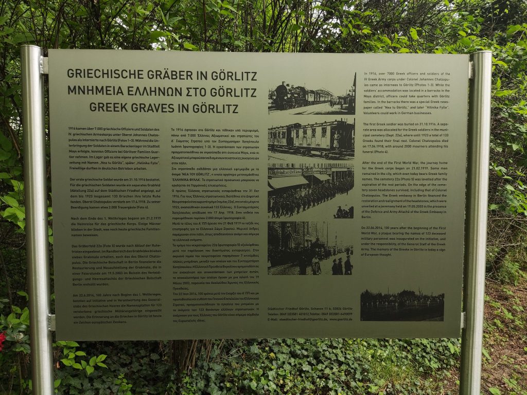| Κατόπιν πρόσκλησης του Δήμου Görlitz, ο Πρόξενος, κ. Ανδρέας Σπυρόπουλος και ο ΑΚΑΜ, Συνταγμ. κ. Ευάγγελος Κολόβης, παρευρέθησαν την Κυριακή 8 Μαΐου 2022 μαζί με τον Πρόεδρο της Ελληνικής Κοινότητας Βερολίνου, κ. Παναγιώτη Ματλή και τον Πρόεδρο του Συλλόγου Μακεδόνων, κ. Κυριάκο Χαϊτίδη στην τελετή μνήμης για το τέλος του Β΄ Παγκοσμίου Πολέμου.Μετά την τελετή, μετέβησαν στο Δημοτικό Νεκροταφείο Görlitz, όπου βρίσκονται ενταφιασμένοι 133 Έλληνες και απόθεσαν στεφάνι στο μνημείο των Ελλήνων Στρατιωτών του Δ΄ Σώματος Στρατού. Auf Einladung der Stadt Görlitz.de nahmen am 8. Mai 2022 der Konsul von Griechenland in Berlin, Andreas Spyropoulos, der Verteidigungsattaché, Oberst i.G. Evangelos Kolovis, der Präsident der Hellenischen Gemeinde zu Berlin e.V., Panagiotis Matlis und der Präsident des Vereins der Makedonen in Berlin e.V. Kyriakos Haitidis nahm an der Gedenkveranstaltung zum Ende des Zweiten Weltkriegs teil. Auf dem Friedhof von Görlitz, wo 133 griechische Soldaten beerdigt sind, legten sie am Denkmal der griechischen Soldaten des 4. Armeekorps einen Kranz nieder. |