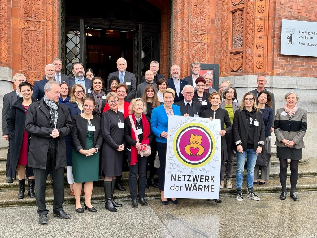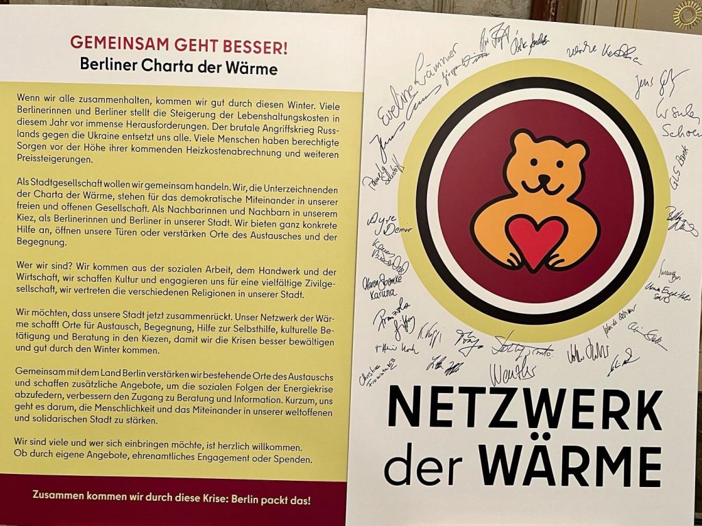 | Περισσότερες από 20 γνωστές προσωπικότητες του Βερολίνου από τους τομείς της πολιτικής, της θρησκείας, της κοινωνικής πρόνοιας, των επιχειρήσεων, της χειροτεχνίας και του πολιτισμού υπέγραψαν την Παρασκευή, 4 Νοεμβρίου 2022, στο Wappensaal του Rotes Rathaus τη Χάρτα της Δίκτυο της Θερμάνσης. Mehr als 20 namhafte Berliner Persönlichkeiten aus Politik, Religion, Sozialwesen, Wirtschaft, Handwerk und Kultur haben am Freitag, den 4. November 2022, die Charta der Wärme zum Netzwerk der Wärme im Wappensaal des Roten Rathauses unterzeichnet. |