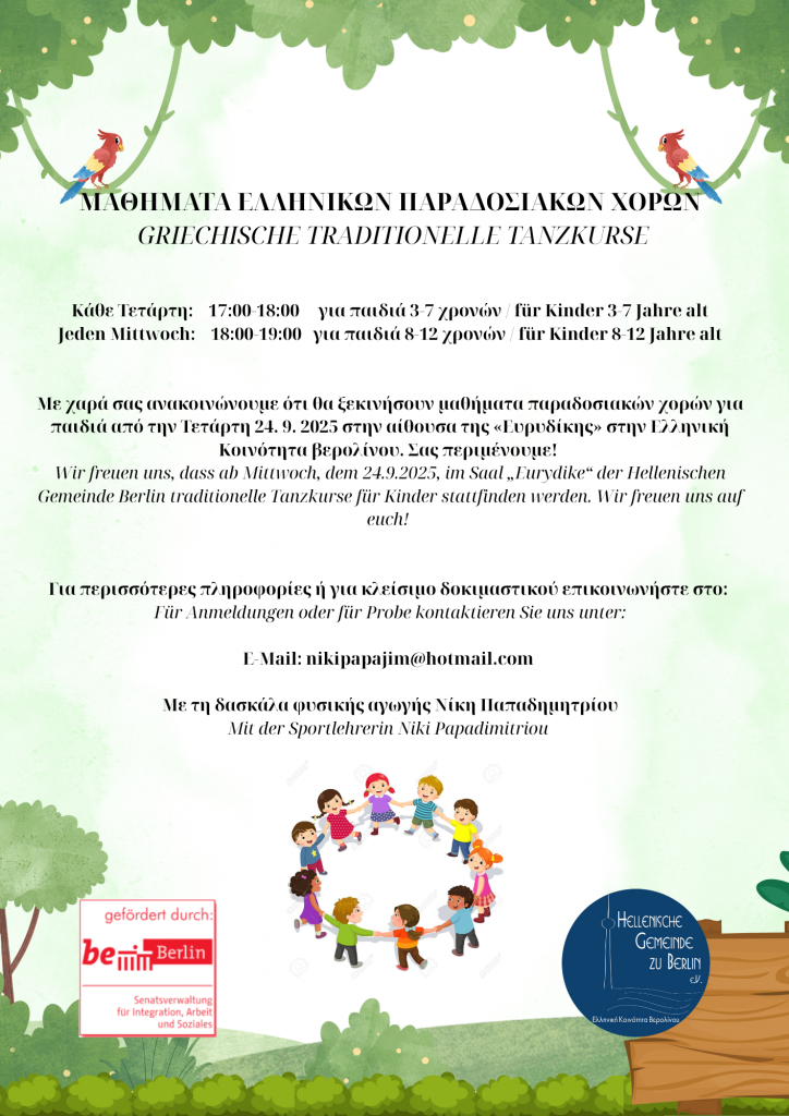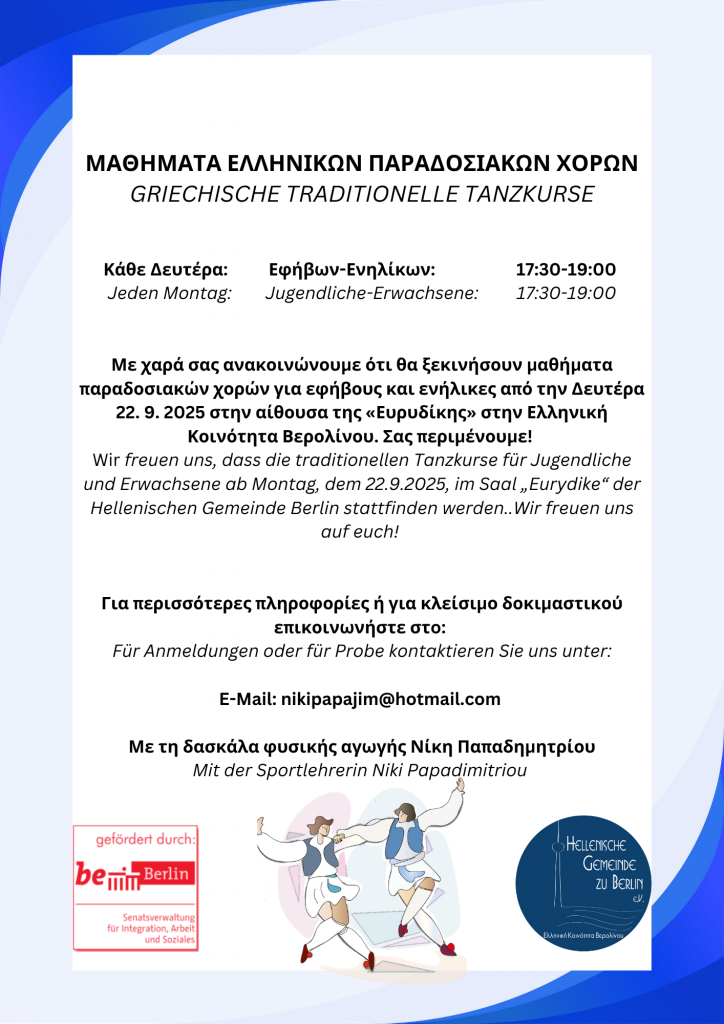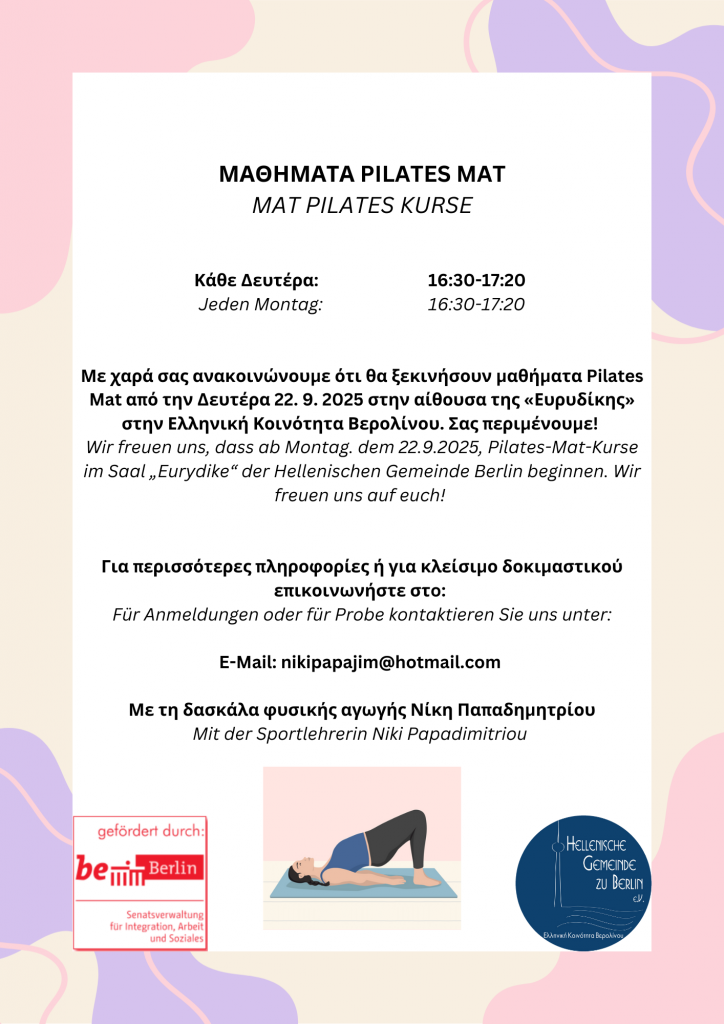 Στην Ελληνική Κοινότητα Βερολίνου προσφέρονται μαθήματα παραδοσιακών χορών και Pilates.