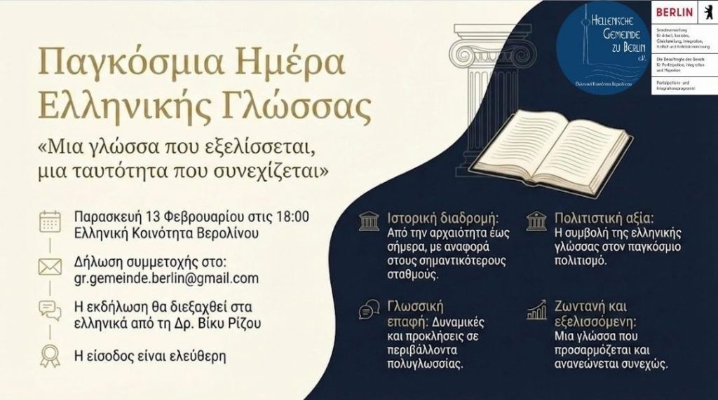 Με αφορμή την Παγκόσμια Ημέρα Ελληνικής Γλώσσας (09.02.2026), η Ελληνική Κοινότητα Βερολίνου διοργανώνει εκδήλωση αφιερωμένη:
