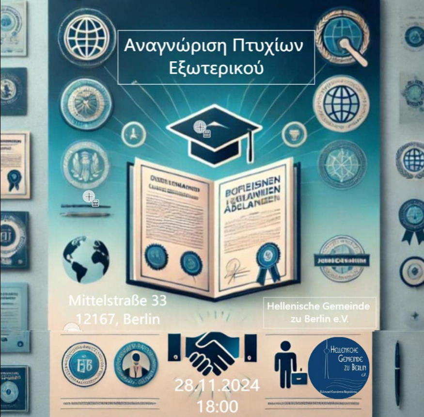 Über das Verfahren zur Anerkennung von im Ausland erworbenen Abschlüssen sprechen wir am Donnerstag, 28. November um 18:00 Uhr in den Räumen der Hellenischen Gemeinde (Mittelstraße 33 , 12167 Berlin) mit der Rechtsanwältin Ourania Kyriakopoulou. Wir werden das Verfahren für die Zeignisbewertung und Anerkennung von ausländischen Abschlüssen erläutern, über verschiedene Expertisen diskutieren und Kontakt zu den entsprechenden Behörden und Trägern aufnehmen, die uns bei der Erstellung unseres Antrags und der Beschaffung der erforderlichen Unterlagen für dieses Verfahren helfen können.