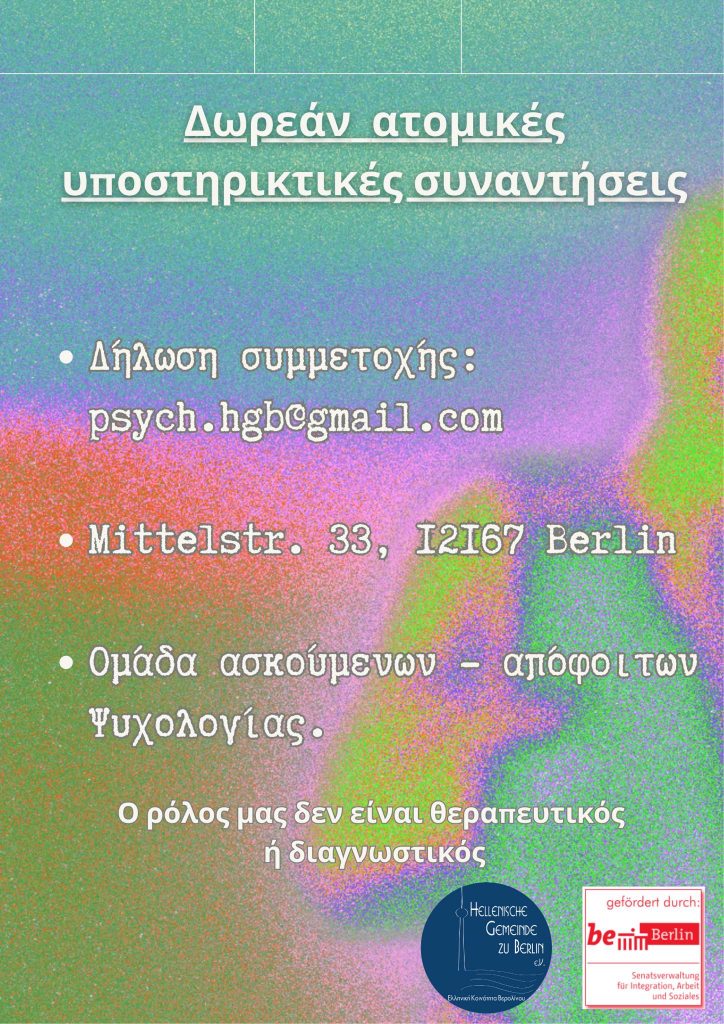 Es werden kostenlose individuelle Unterstützungsgespräche nach Absprache per E-Mail an: psych.hgb@gmail.com angeboten, die auf Griechisch stattfinden. Das Treffen finden in den Räumen der Hellenischen Gemeinde Berlin (Mittelstr. 33, 12167) statt. Die Plätze sind zahlenmäßig begrenzt (bis zu 5 pro Person).