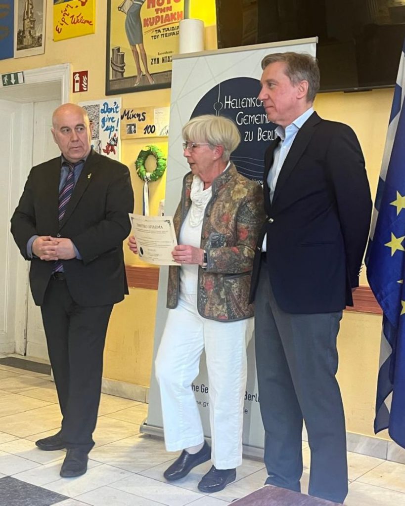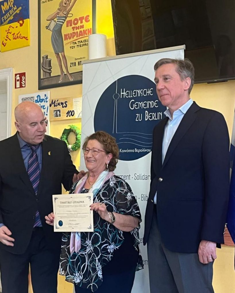 Der Höhepunkt der Veranstaltung war die Verleihung von Ehrenurkunden an Frauen der ersten und zweiten Generation des griechischen Lebens in Berlin – Frauen, die mit ihrer Arbeit, ihrer Würde und ihrem stillen Engagement Vereine, Schulen, die Kirche, Familien und die Gemeinschaft unterstützt und zur Entwicklung der griechischen Präsenz in der Stadt beigetragen haben.